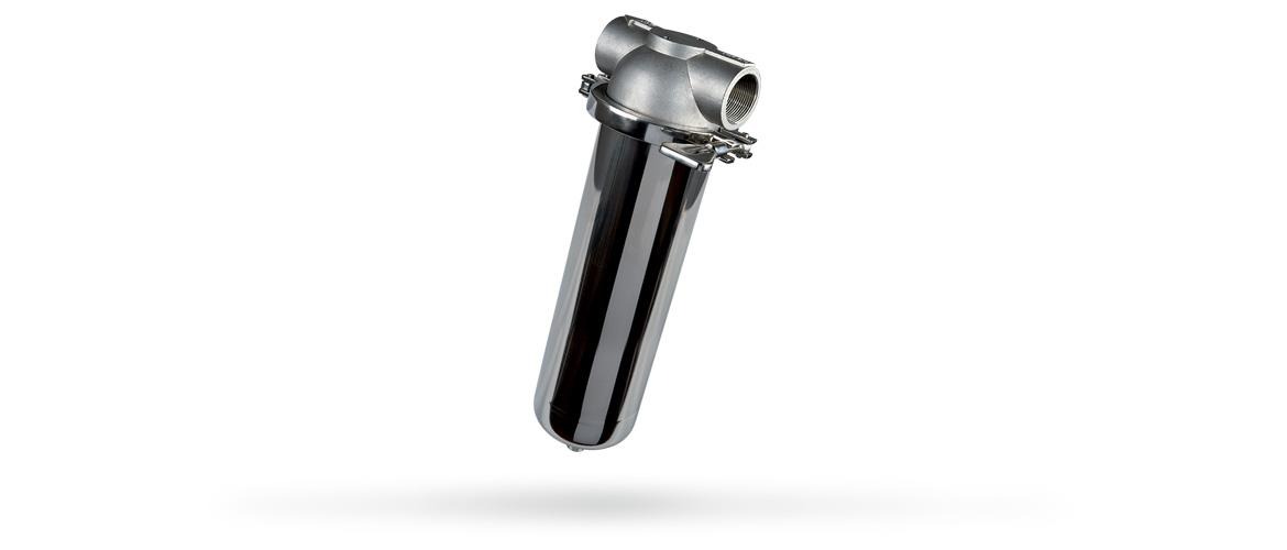 Sono formati da bicchiere in acciaio inox AISI 316 con attacchi IN/OUT da 1" e in grado di ospitare cartucce SX (DOE) di altezza 10”.
